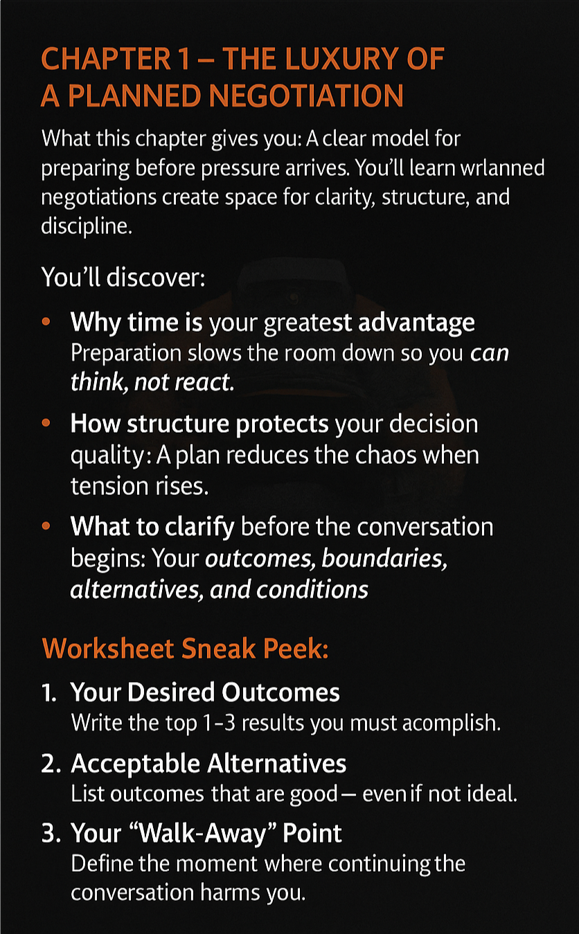 A practical workbook that helps you think clearly under pressure and walk into any negotiation with confidence and structure.